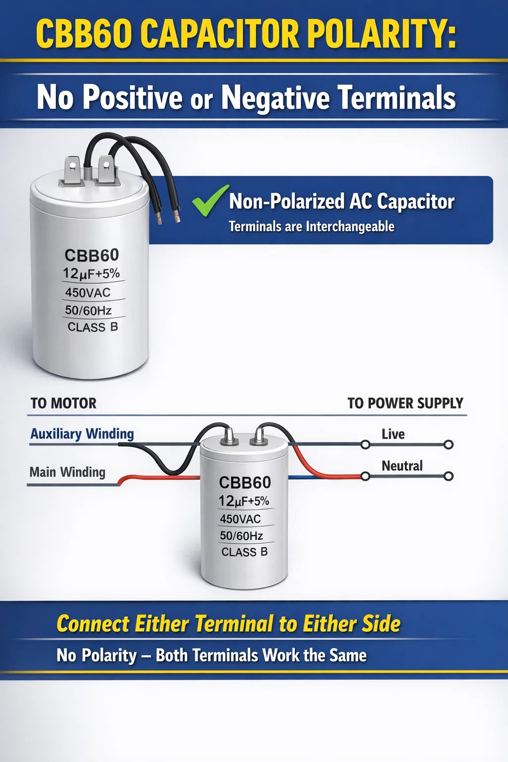 CBB60 capacitor est neque positivus sive negativus . AC capacitor non-polarizatus est, qui significat nullum positivum vel negativum terminatum designatum habet. Aut terminum ad utramque partem circuii coniungere potes sine periculo damni vel malfunction. Haec est una ex praecipuis notis quae eam ab capacitoribus electrolyticis distinguunt, quae stricte polarizatae sunt et deficient — vel etiam explodunt — si perperam cohaerent.