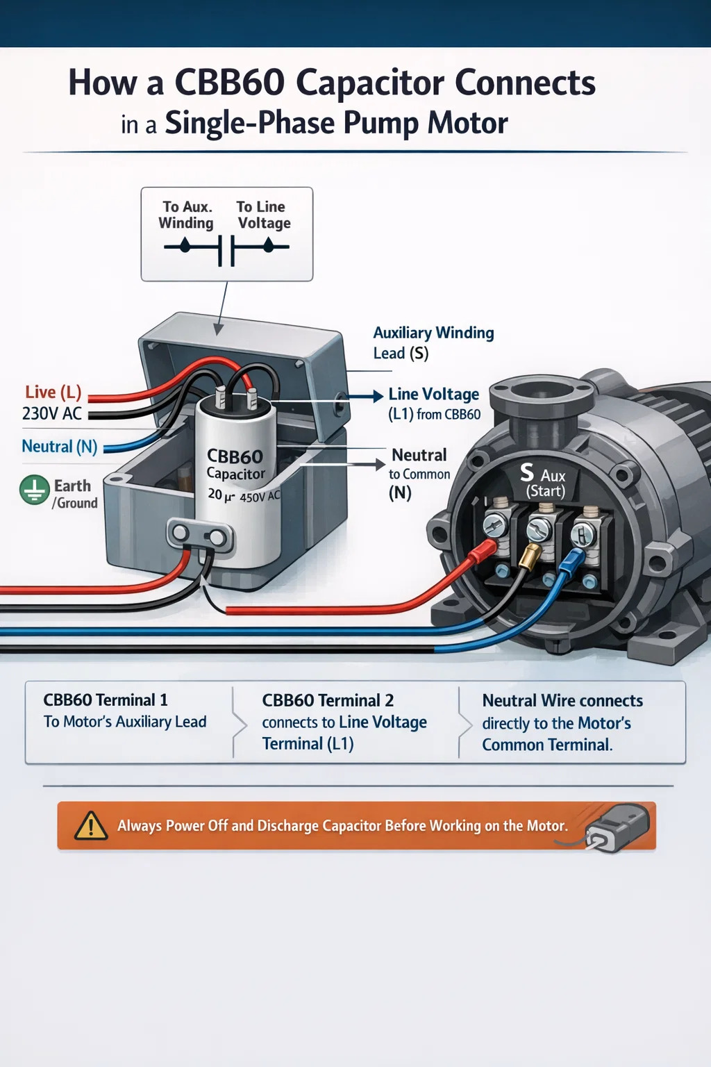 A CBB60 capacitor connectit in parallelis per flexuosa auxilia motoria — non in serie cum linea principalis. Eius duo terminales non-polarizati sunt, quare nec positivus vel negativus est ut cures. Una terminatio accedit ad plumbum flexuosum auxiliarium motoris, et alia coniungit cum linea intentione terminali (eodem puncto quod principale curvis pascitur). Phase derivare creat motorem necesse est torques generare et efficaciter currere.