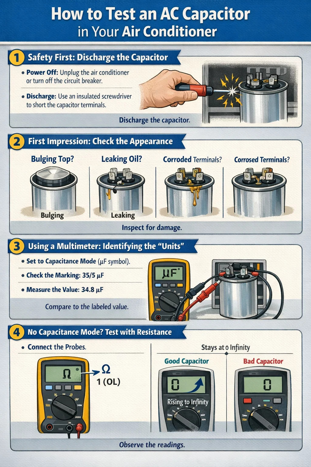 Determinans utrum AC capacitor in aere Conditioner sit bonus vel malus, non requirit scientiam electronicarum professionalium machinalem. Quamdiu multimetrum cum "capacitate test" functionis habes, hos gradus sequi potes ac semi-expertus fias.