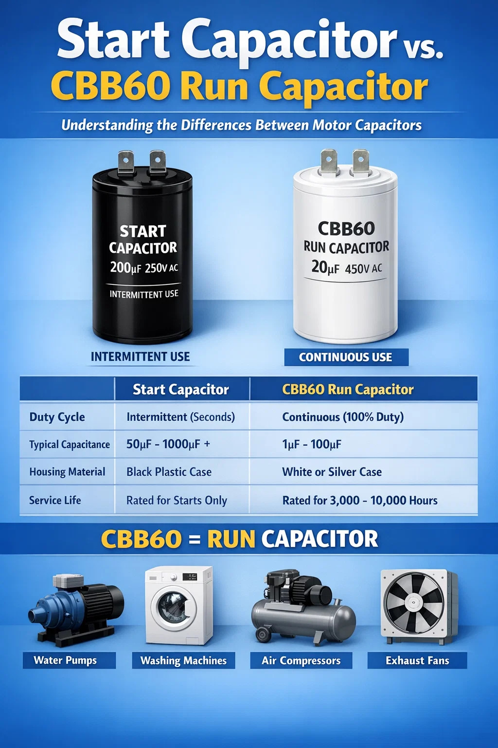 Commune est utentibus haec duo confundere quia motores ambo adiuvant. Attamen eorum "stamina electrica" valde diversa est. Capacitor satus usus in loco a CBB60 capacitor in defectu calamitosae intra minuta eveniret quod capacitores satus non ordinantur ad calorem continui AC currentis dissipandum.