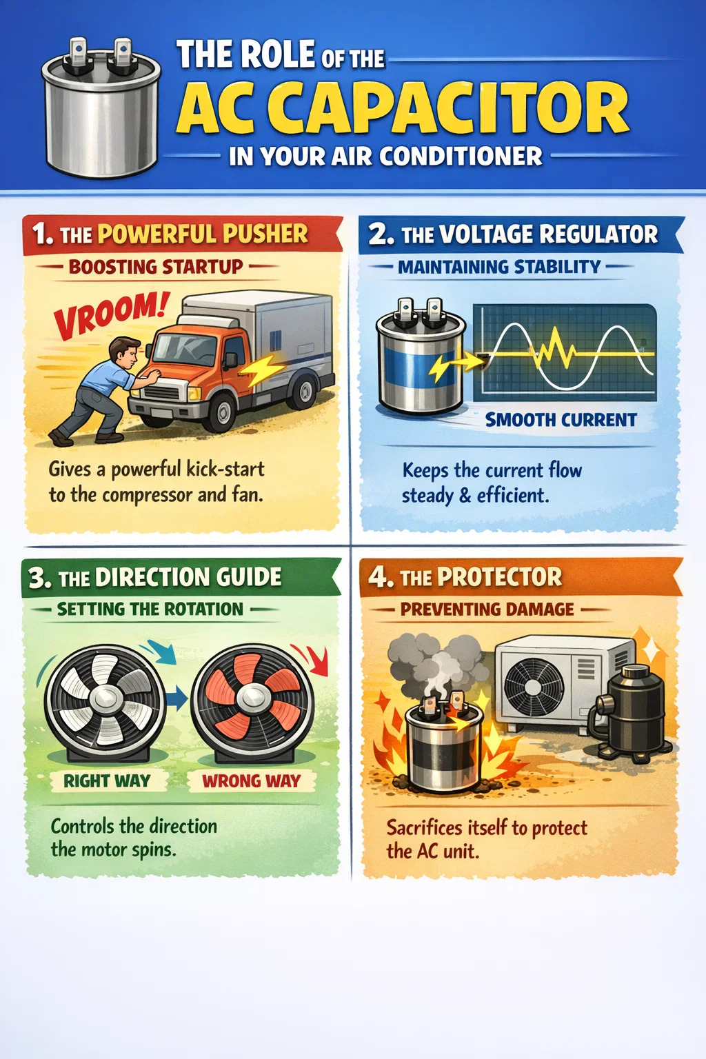 The AC capacitor (capacitas caeli Conditioner) est instar "activi tergum" vel "cursoris" in tuo aere Conditioner. Etsi parvum est, plerumque parvum metallum argenteum potest, aer Conditioner tuus sine eo currere non poterit.